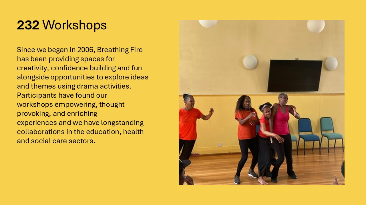 September 2024 | Rose Green Centre, African Caribbean Expo. An event focused on Sickle Cell for people of all ages and generations. An interactive workshop and performance where Breathing Fire collaborated with Black Women Let Loose Theatre Company to explore myths and facts about sickle cell. Breathing Fire provided a platform for attendees to share their stories about living with sickle cell and the impact on their loved ones.