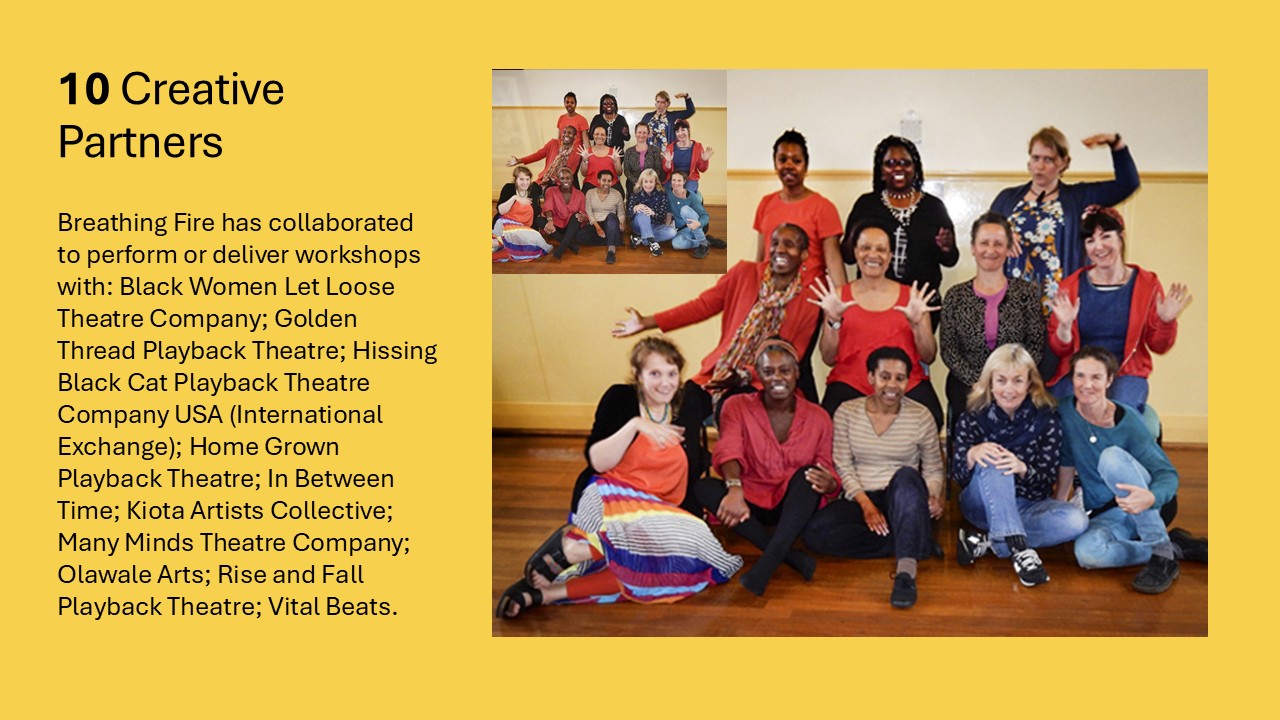 February 2023 | University of Bristol Introduction to Playback Theatre Masterclass. Breathing Fire delivered an ‘Introduction to Playback Master class’ for second year drama students. Discussing the history of Playback, Playback as a vehicle for Social Change, and Breathing Fire’s origins. Teaching Playback warm up processes; Fluid Sculpts; Transitional Fluids; and One Minute Poetry through the theme of Social Change.